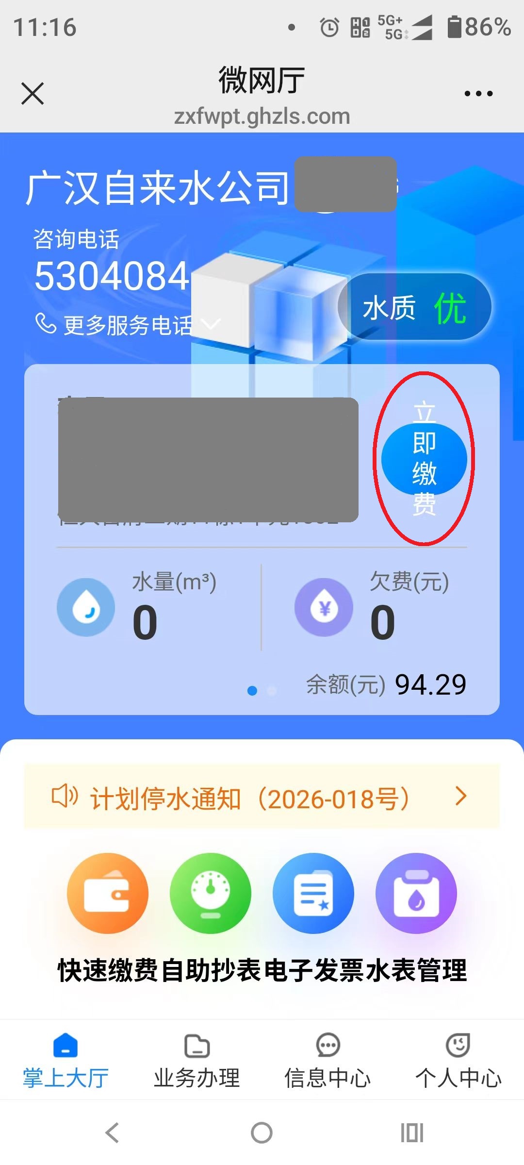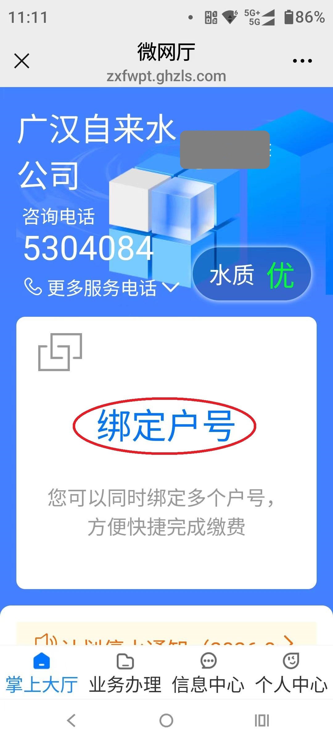 进入微信界面搜索关注“广汉市自来水公司”公众号,或扫以下二维码关注自来水公司公众号:
