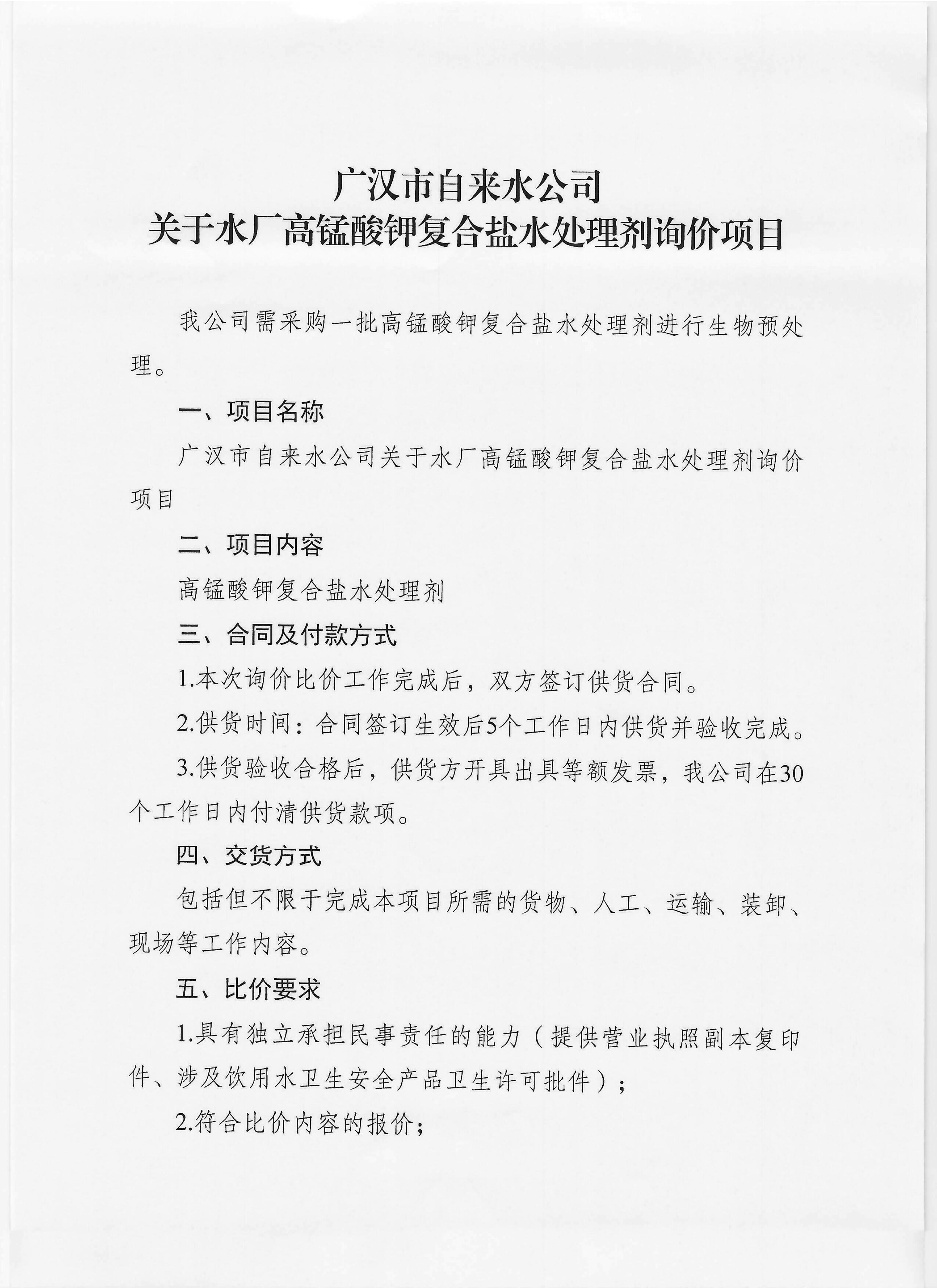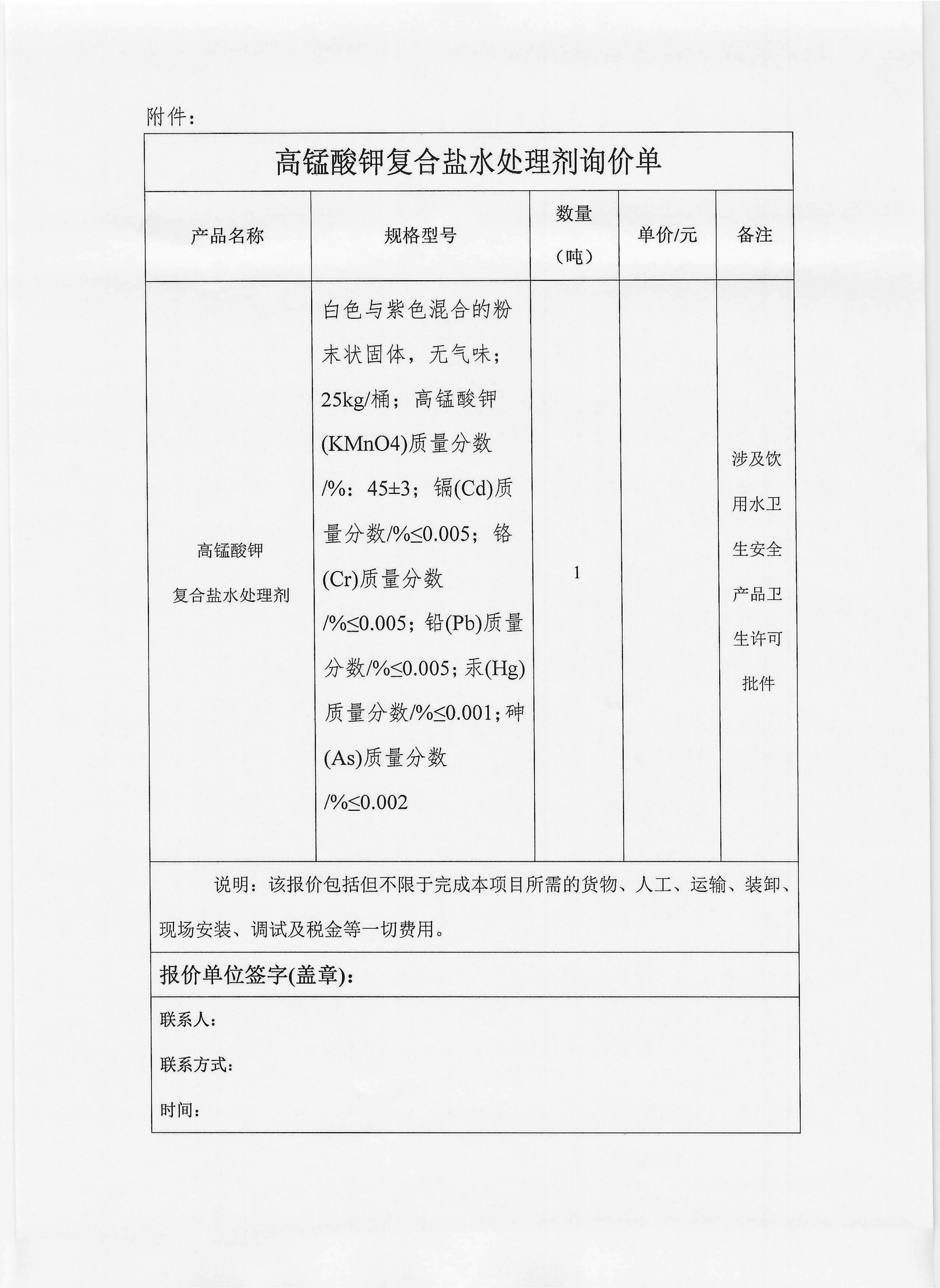 关于水厂高锰酸钾复合盐水处理剂询价项目