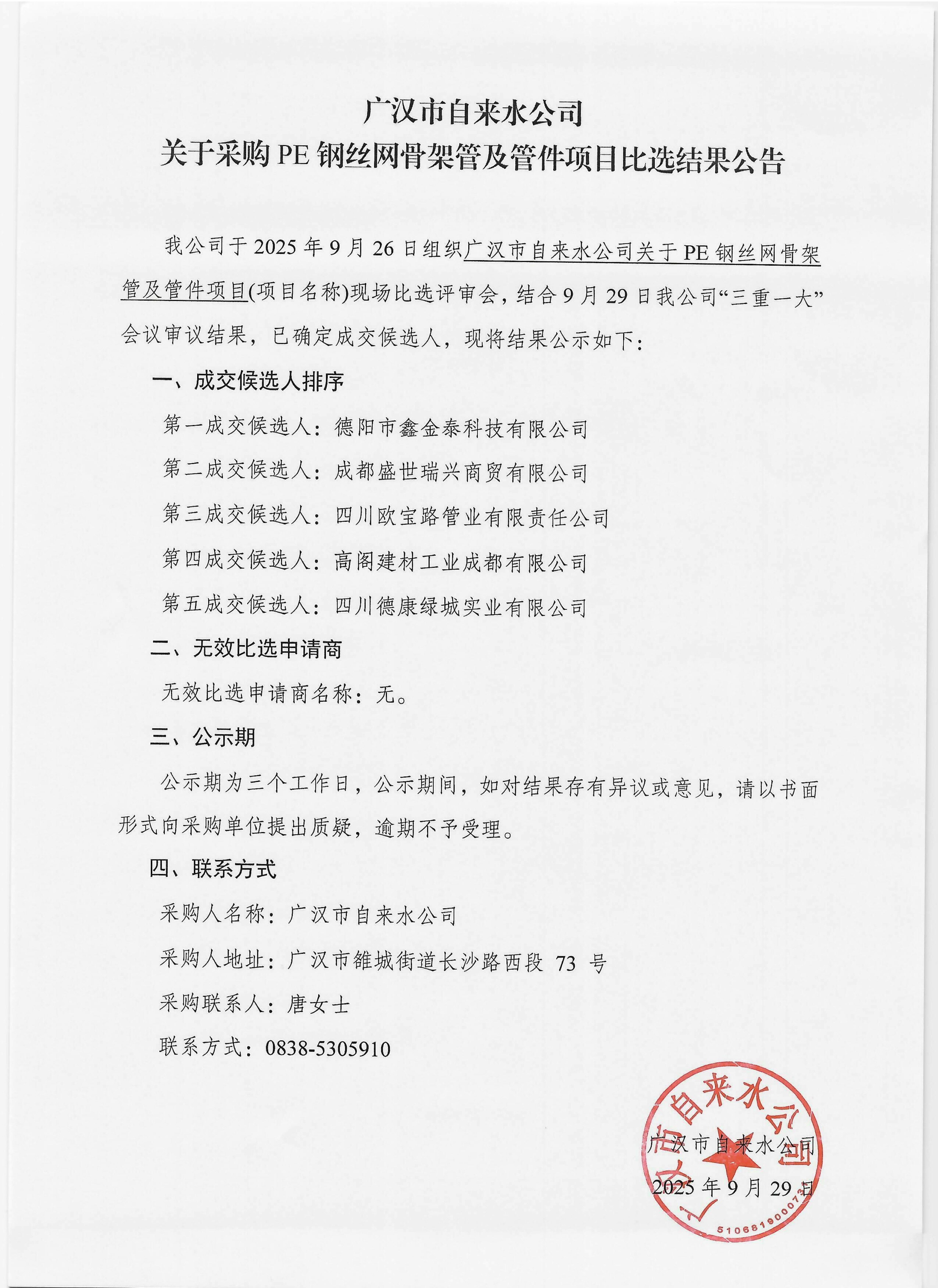 关于采购PE钢丝网骨架管及管件项目比选结果公告