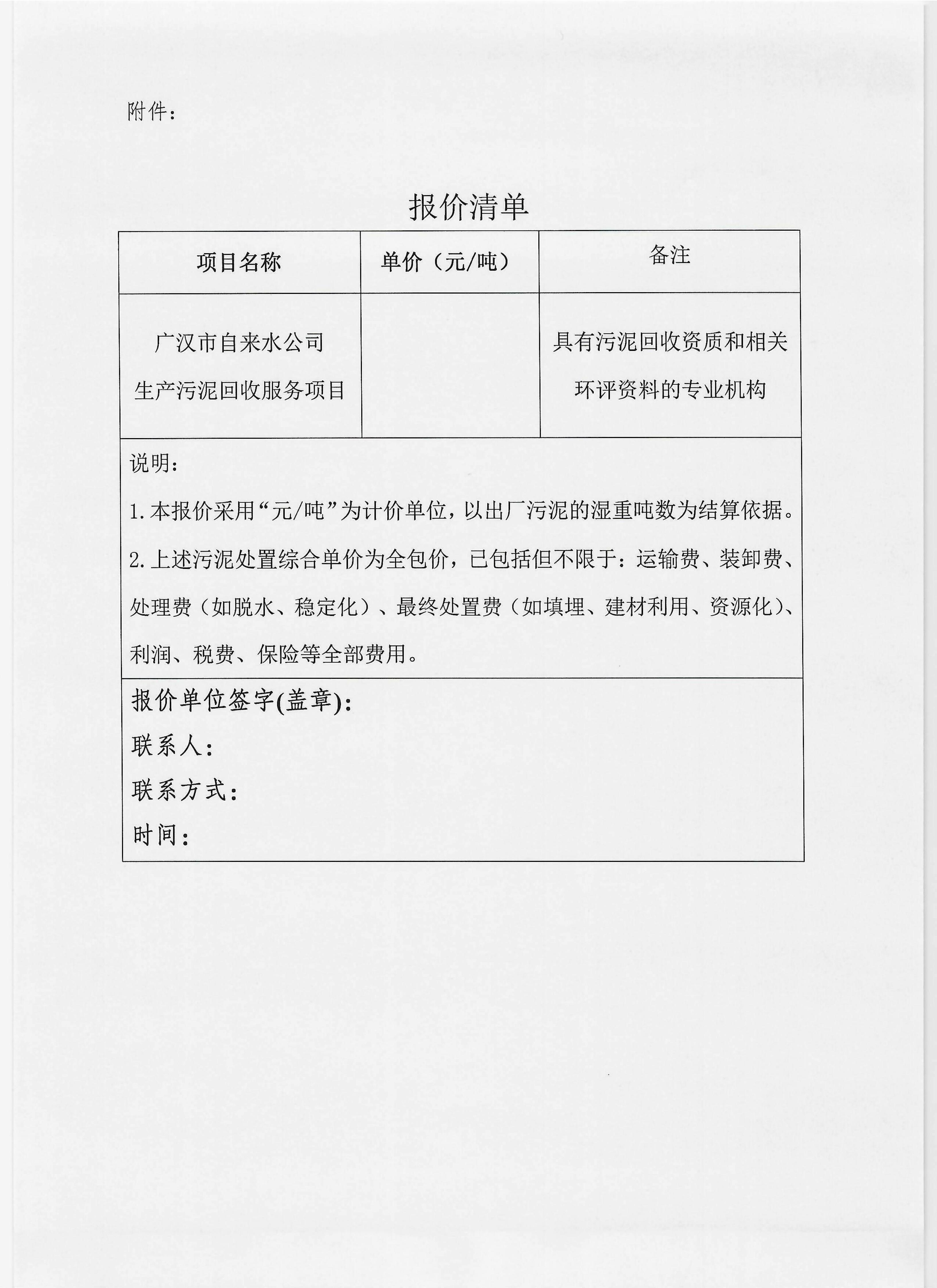 关于生产污泥回收服务项目询价函