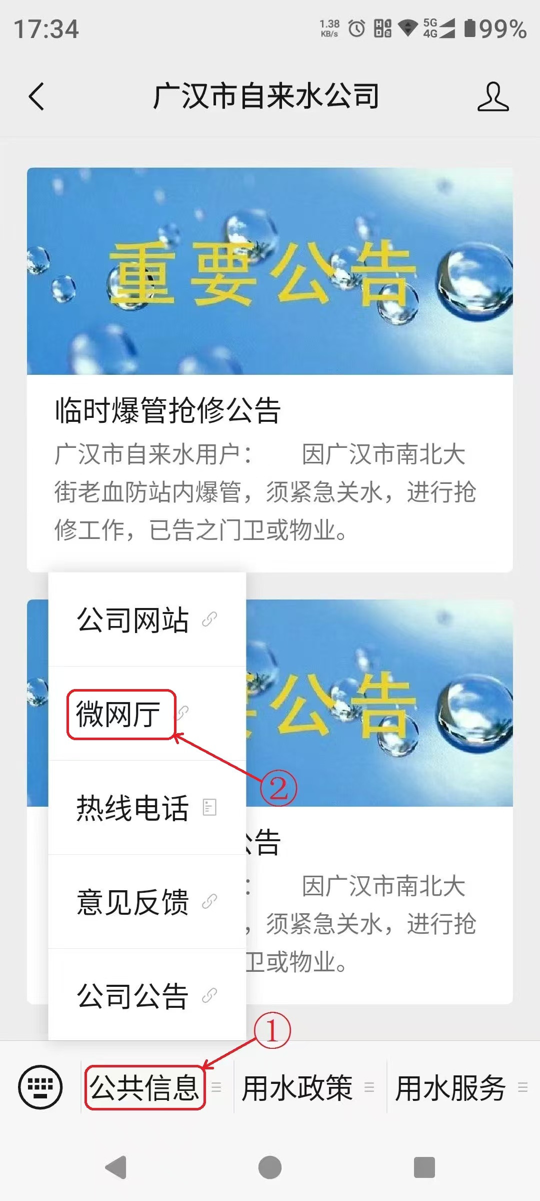 进入微信界面搜索关注“广汉市自来水公司”公众号,或扫以下二维码关注自来水公司公众号: