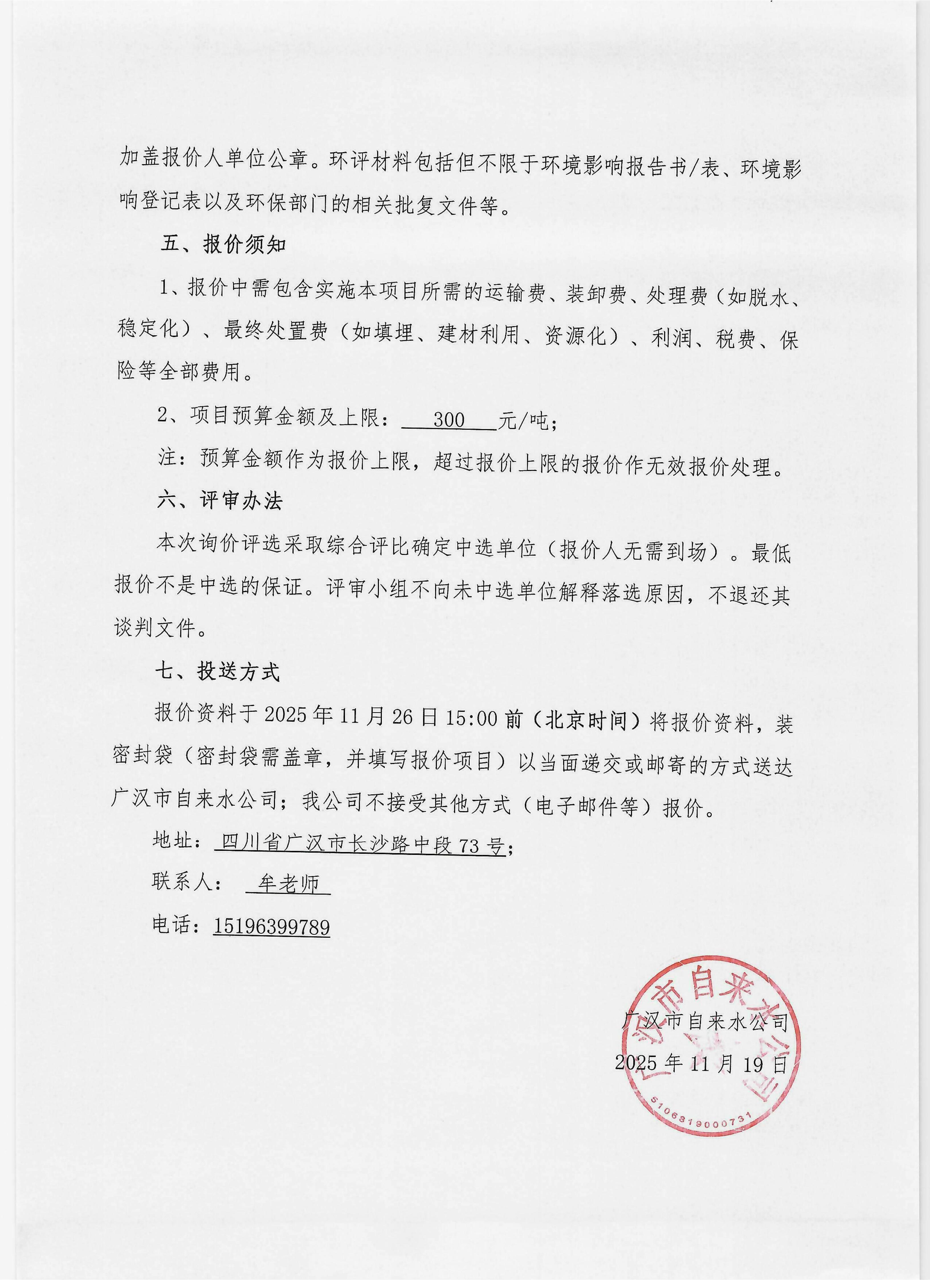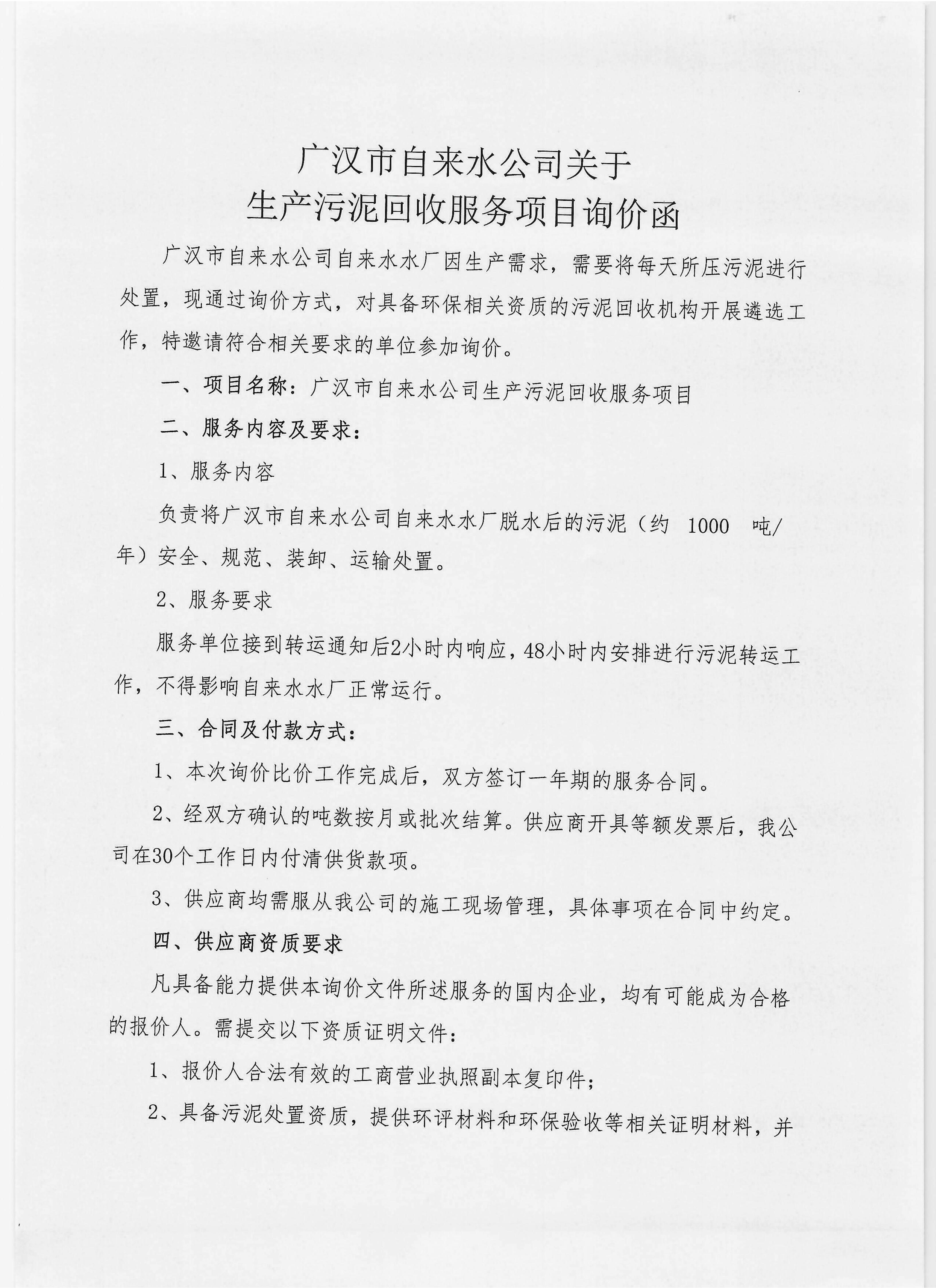 关于生产污泥回收服务项目询价函